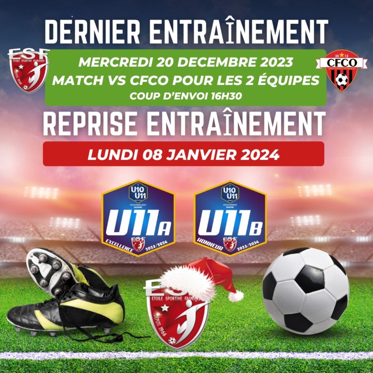Dernier Entrainement ce mercredi 20 décembre pour les 2 équipes qui finiront l'année sur une confrontation avec le CFCO, coup d'envoi à 16h30.