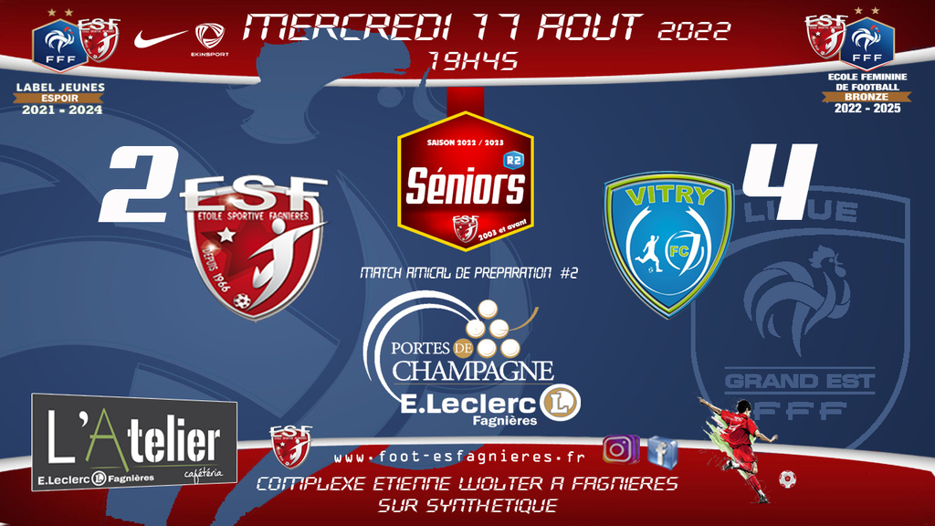 2ème match de préparation pour nos Séniors R2 qui auront plaisir à rencontrer Vitry Fc R3 sur le terrain synthétique du complexe Etienne Wolter de Fagnières à 19h45 (coup d'envoi).