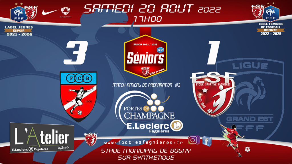 3ème match de préparation pour nos Séniors R2 qui auront plaisir à rencontrer Bogny Fc R1 sur leur terrain synthétique de Bogny à 17h00 (coup d'envoi).