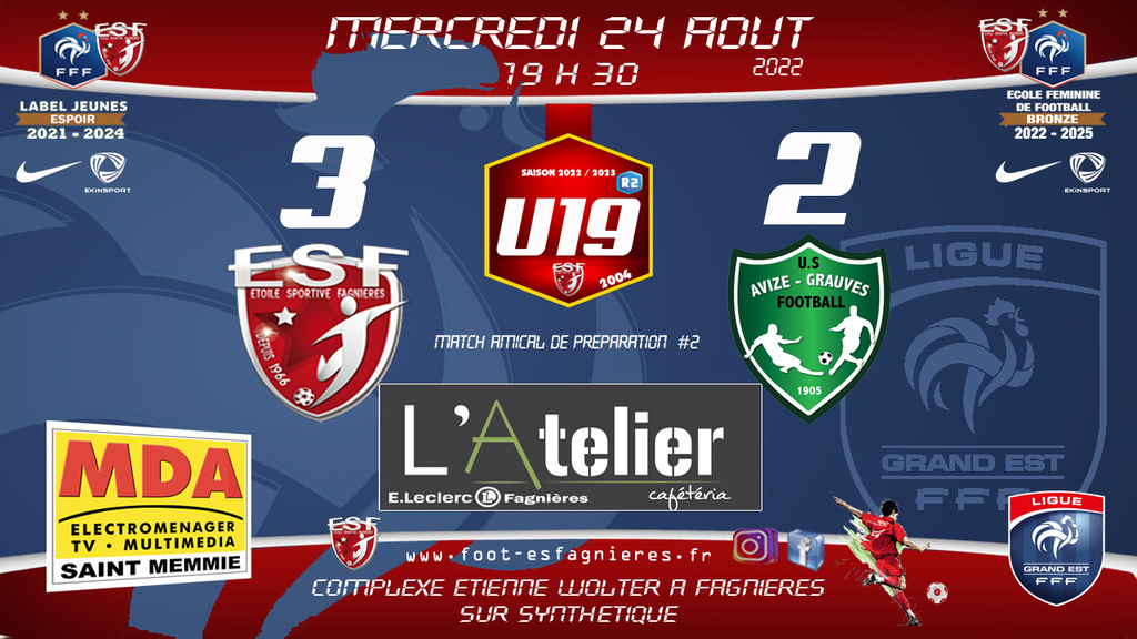 Nos Partenaires, L'Atelier Cafétéria Leclerc & MDA Electroménager Saint Memmie vous invitent au 1er match de préparation pour cette nouvelle saison 2022/2023 de nos U19 qui recevront Avize Grauves Us R2 sur le terrain synthétique du complexe Etienne Wolter de Fagnières à 19h30 (coup d'envoi).