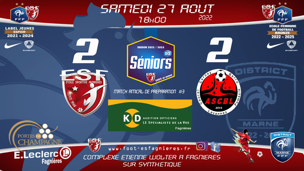 3ème match de préparation pour nos Séniors D2 qui auront plaisir à rencontrer Cernay Berru D1 sur synthétique au complexe Etienne Wolter de Fagnières à 18h00 (coup d'envoi).