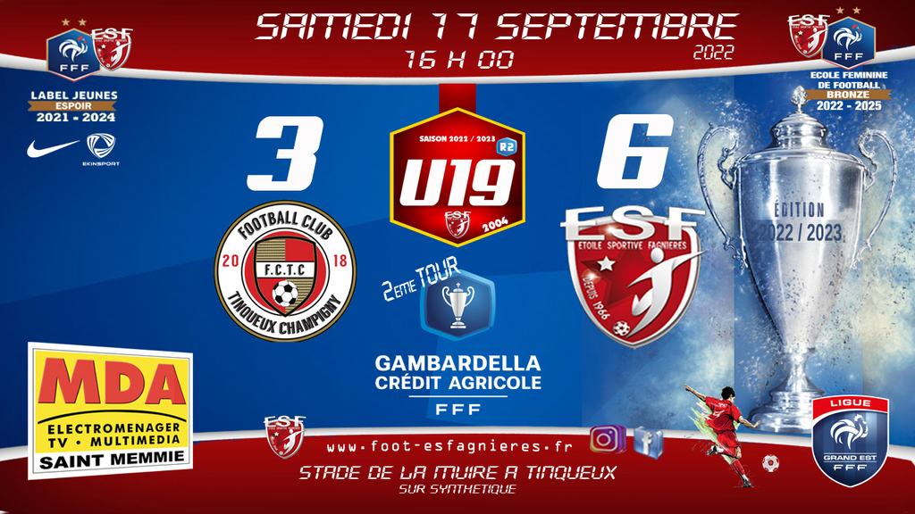 𝗨𝟭𝟵𝗥𝟮 - 𝗖𝗢𝗨𝗣𝗘 𝗚𝗔𝗠𝗕𝗔𝗥𝗗𝗘𝗟𝗟𝗔 ! 2ème Tour de la Coupe Gambardella Ligue du Grand Est de Football Champagne/Ardenne pour nos jeunes U19.