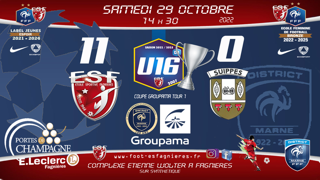1er tour de Coupe Groupama pour nos U16 qui recevront l' Olympic Suippas ce samedi 29 octobre à 14h30 au complexe Etienne Wolter de Fagnières sur synthétique.