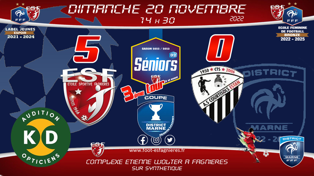 3ème tour de coupe Chauvin Lesoeur contre Courtisols au complexe Etienne Wolter de Fagnières sur synthétique, coup d'envoi 14h30.