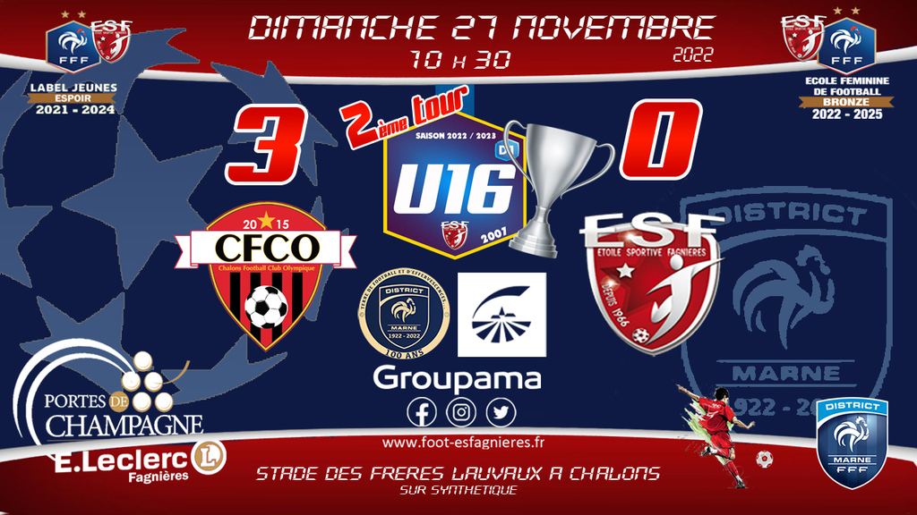 2ème tour de Coupe Groupama pour nos U16 face au CFCO, qui se déplaceront au Stade des Frères Lauvaux à Châlons, coup d'envoi 10h30 sur synthétique.