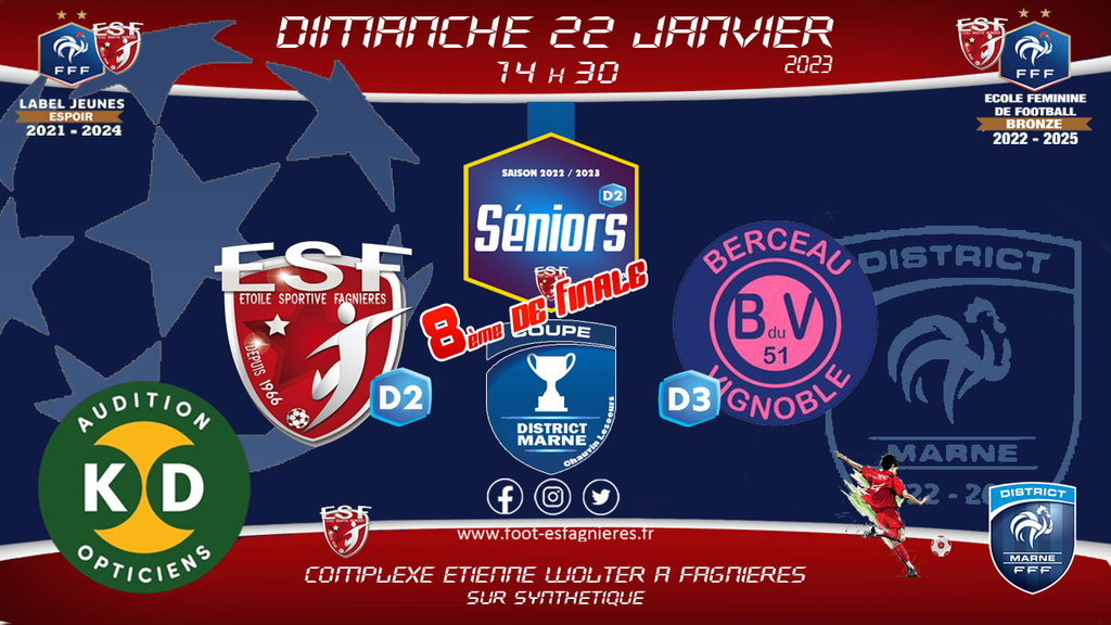 Le groupe de Jordan Calvy recevra avec plaisir Berceau du Vignoble (Hautvillers) (pensionnaire de D3) pour les 8ème de finale de Coupe District CHAUVIN LESOEUR, au complexe Etienne Wolter de Fagnières sur synthétique, coup d'envoi 14h30.