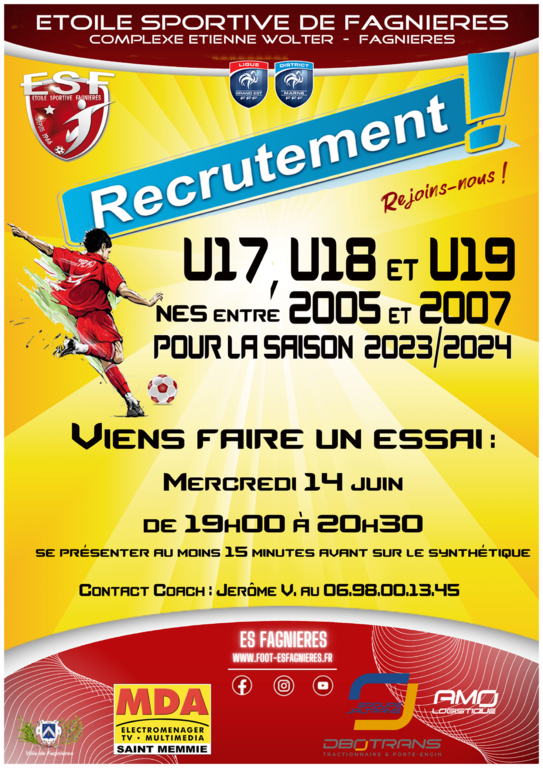 L' Etoile Sportive de Fagnières débute sa campagne de recrutement pour la saison 2023/2024 par la catégorie U17 à U19 des années 2005, 2006 & 2007.
