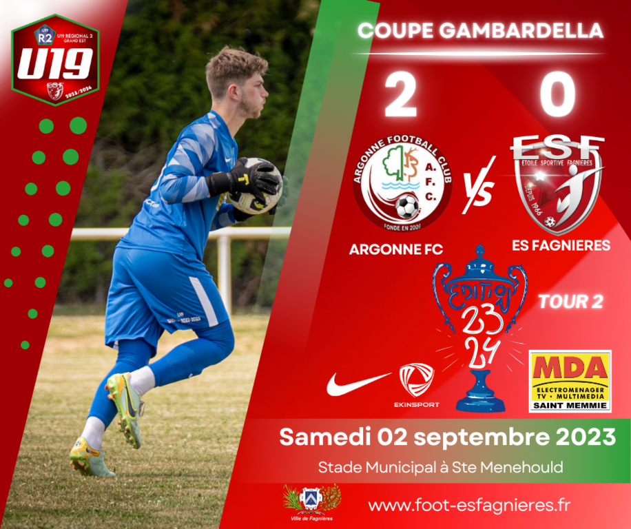 2ème tour de Coupe Gambardella qui devront se déplacer à Sainte Ménéhould. couop d'envoi 16h00.