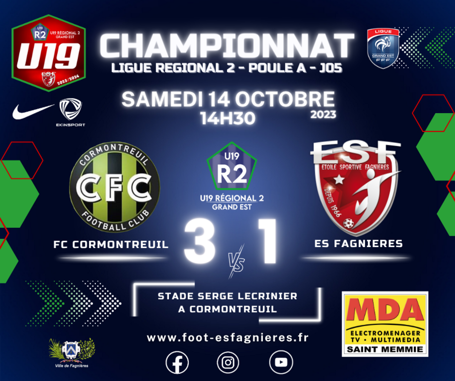 Une petite défaite pour nos jeunes U19 sur les terres de Cormontreuil 3 à 1, menés 2 buts à 1 à la mi-temps (but de Nolan à la 42ème), Thomas ayant retardé le break à plusieurs reprises, le groupe de Jessy aurait presque pu créer la surprise, dommage pour ce groupe qui mérite mieux sur ce début de saison....