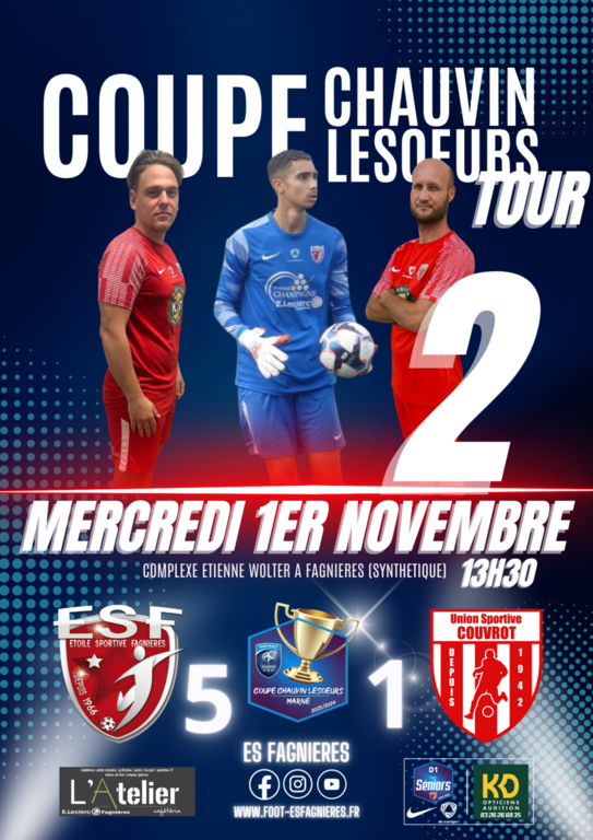 Réception de Couvrot Us pour ce 2ème tour de Coupe pour nos Séniors Marne, venez nombreux encourager les Hommes de Jordan Calvy au complexe Etienne Wolter de Fagnières, coup d'envoi 13h30.
