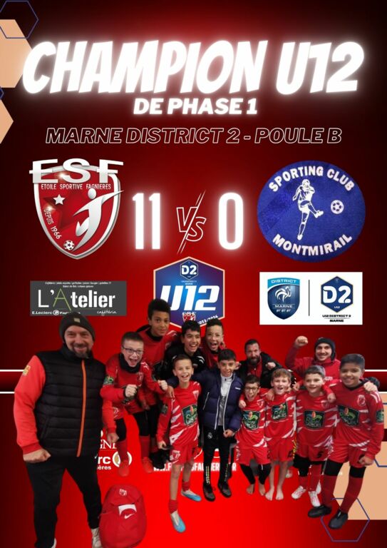Bravo à nos "petits" U12 qui termine cette 1ère phase Champions de leur Groupe grâce à cette victoire face au Sporting Club Montmirail que nous remercions pour leur venue et à qui nous souhaitons une excellente phase 2.