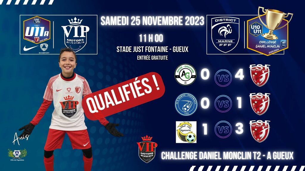 Bravo à nos jeunes U11 & au staff qui rentre de Gueux avec la qualification en poche... en faisant un carton plein, 3 matchs, 3 victoires, 2 séances/3 de tirs au but remportés !! ![]()