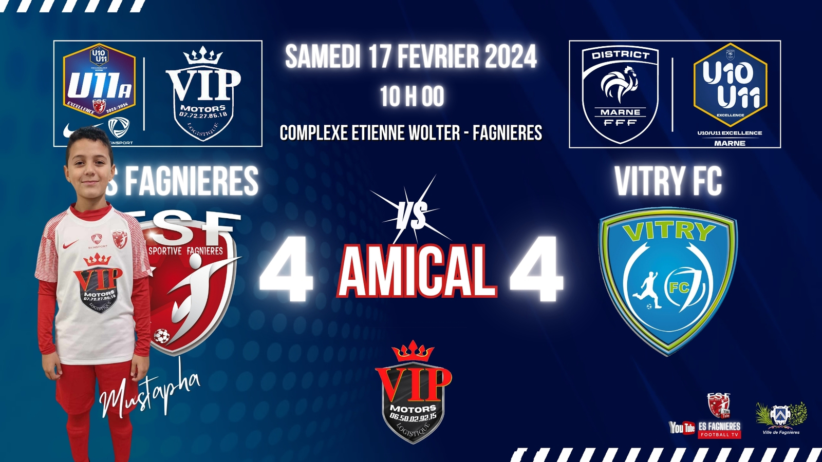 Retour sur l'opposition de ce matin U11A contre Vitry sa match nul 4-4 dommage, mener 4 -2 à 3 minutes de la fin et ce faire rejoindre