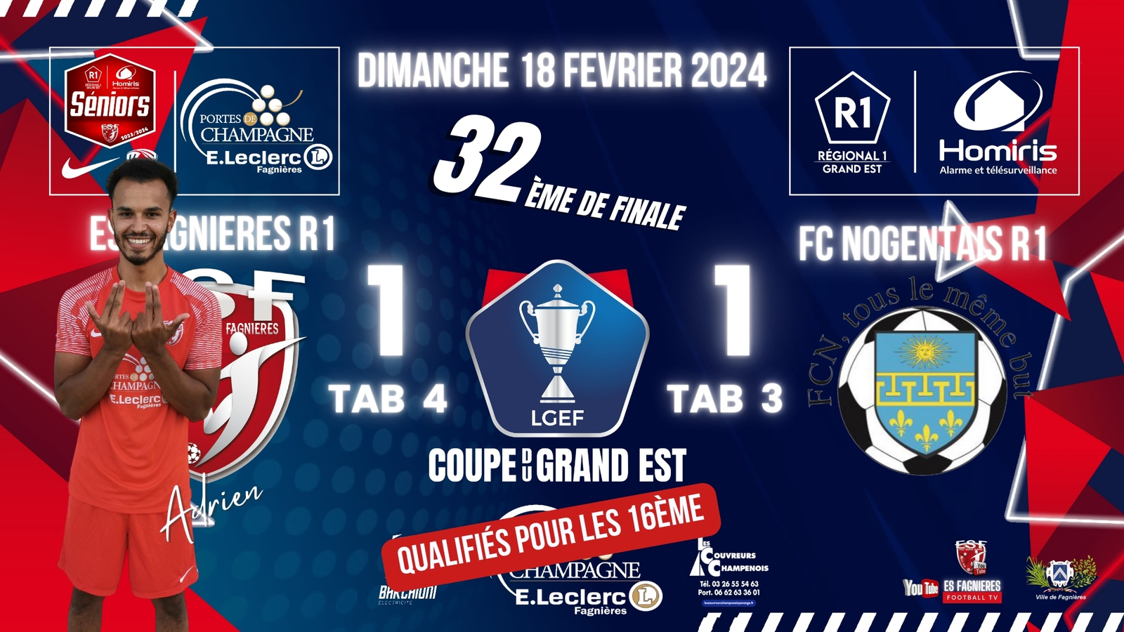Le Groupe Ligue R1 de Jerome Van-Nieuwenhuyse recevra "dans la foulée" le FC Nogentais, pensionnaire de Régional 1 pour ce 32ème de Finale de Coupe du Grand Est de Football Champagne/Ardenne,