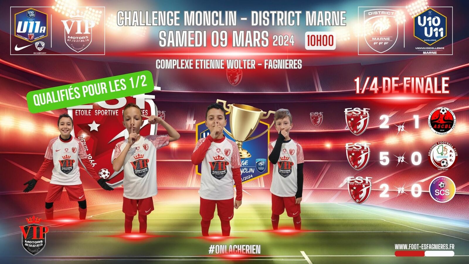 Nos U11A recevront a FAGNIERES pour ce 1/4 de Finale de Challenge.