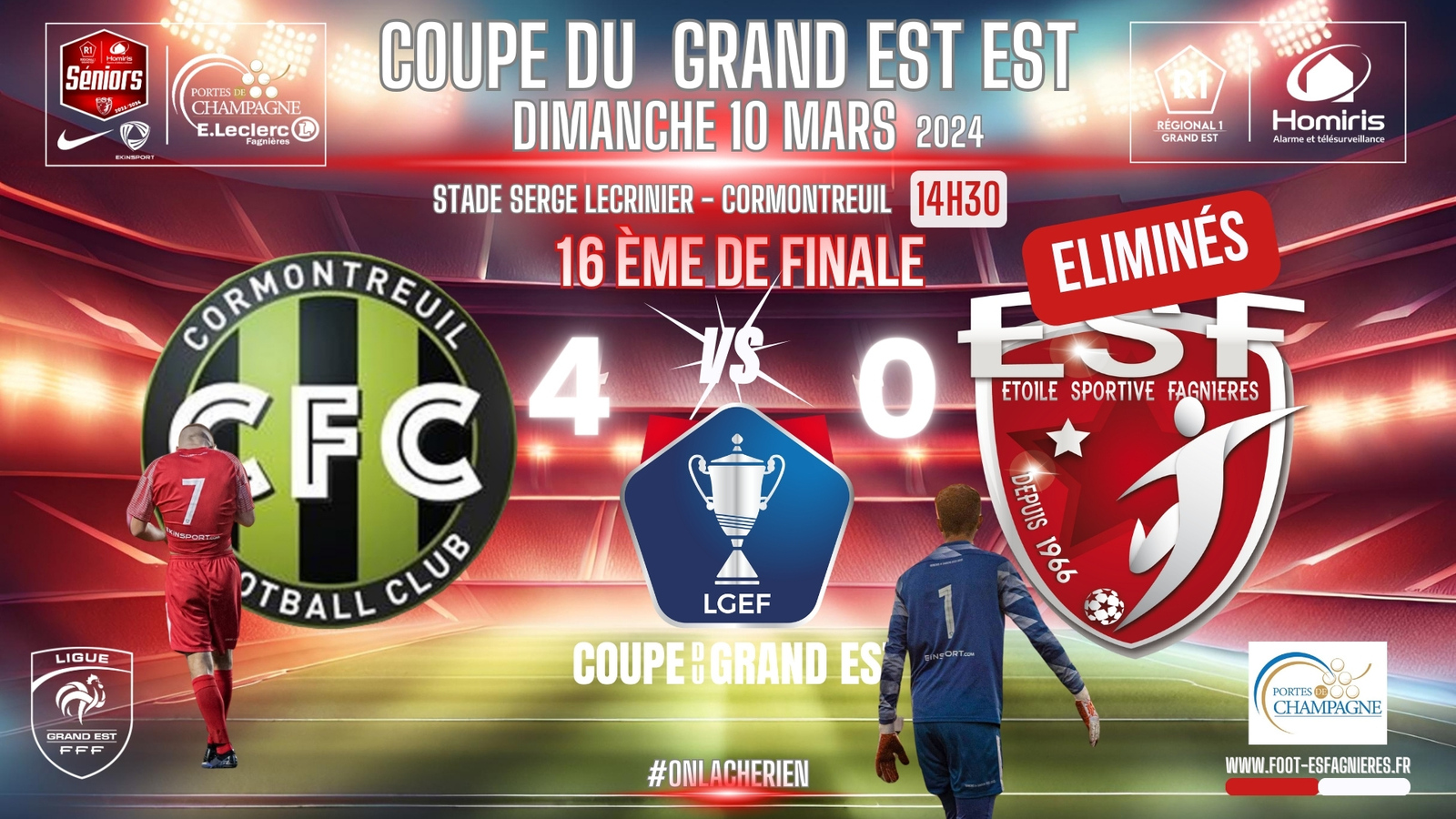 éplacement a Cormontreuil pour le Groupe R1 de Jerome Van-Nieuwenhuyse qui devra créer l'exploit du week end pour accéder au 8eme de Finale de cette Coupe de la Ligue du Grand Est de Football Champagne/Ardenne face a une équipe rodée aux matchs de haut niveau...