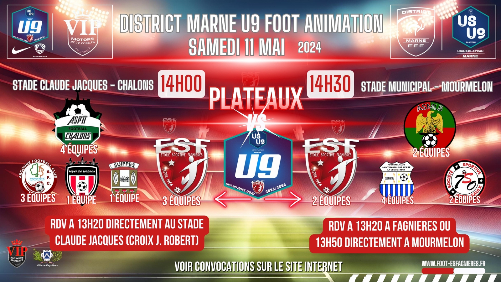 Voir les convocations & heure de rendez vous sur le site : https://www.foot-esfagnieres.fr/saison-2023-2024/equipes/equipe-u7-u8-u9---nes-en-2017-2016---2015-saison-2023-2024-126048