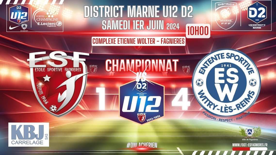 A 2 Matchs de la fin de Championnat, nos jeunes U12 auront plaisir à recevoir l' ES WITRY LES REIMS ce Samedi 1er juin au Complexe Etienne Wolter de fagnières...