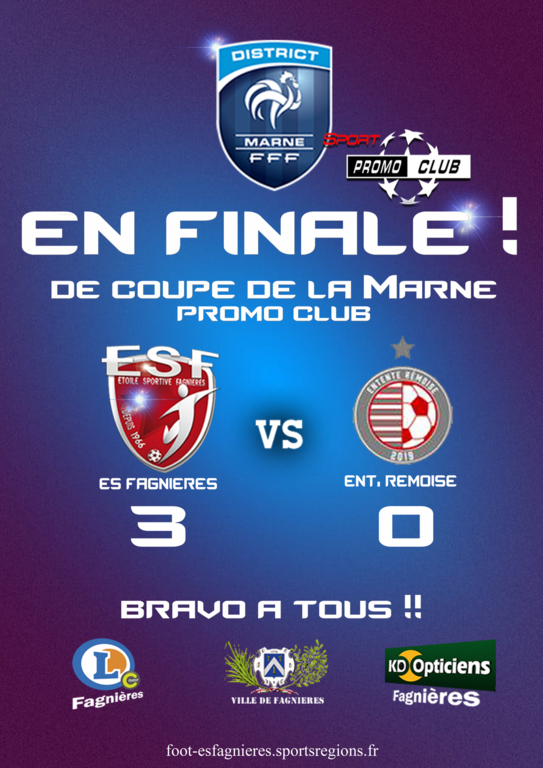 En effet ce dimanche 05 juin, les hommes de Jordan Calvy sont venus à bout de l'Entente Rémoise à domicile 3 à 0 et ains accède à la FINALE de la Coupe de la Marne District Marne de Football contre Coteaux Sud qui s'est imposé 5 à 0 face à l'Us Tardenoise dans l'autre demi-finale.