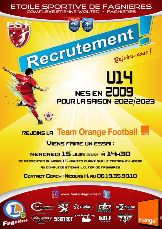 L' ES Fagnières invite les joueurs déjà licenciés (U13 actuels de la saison 2021/2022 nés en 2009) et non licenciés à se présenter sur le terrain en herbe du Complexe Etienne Wolter de Fagnières a la séance d'essai correspondante ci-dessous !