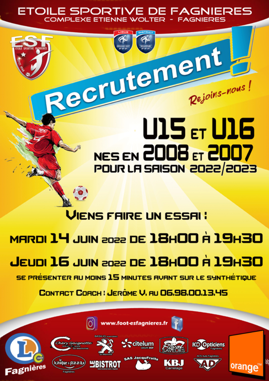 L' ES Fagnières invite les joueurs déjà licenciés (U14 actuels de la saison 2021/2022 nés en 2008) et non licenciés à se présenter sur le synthétique du Complexe Etienne Wolter de Fagnières aux séances d'essais correspondantes ci-dessous !