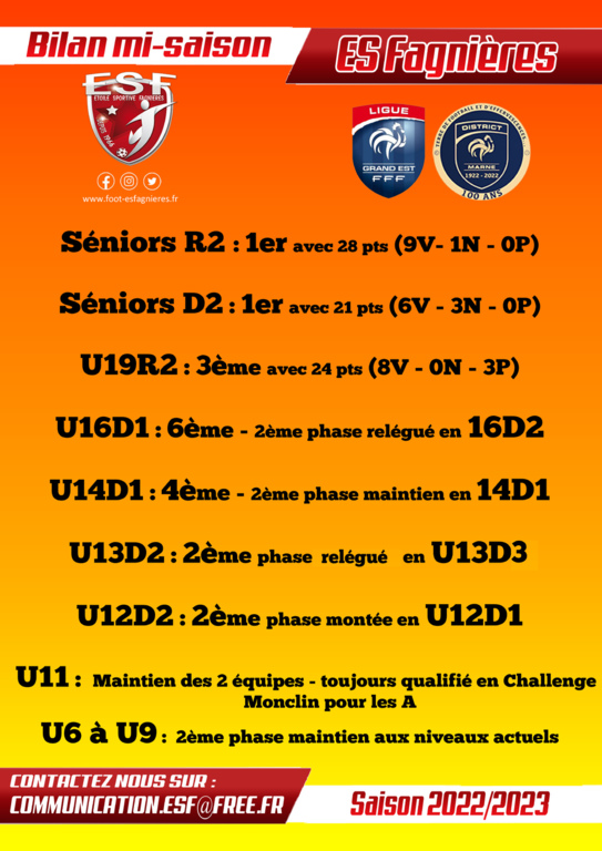 Retrouvez ici le bilan sportif de l'Etoile Sportive de Fagnières à la mi-saison, avec des résultats exceptionnels pour cette 1ère partie de saison, notamment pour nos 3 équipes fanions, félicitations à tous !