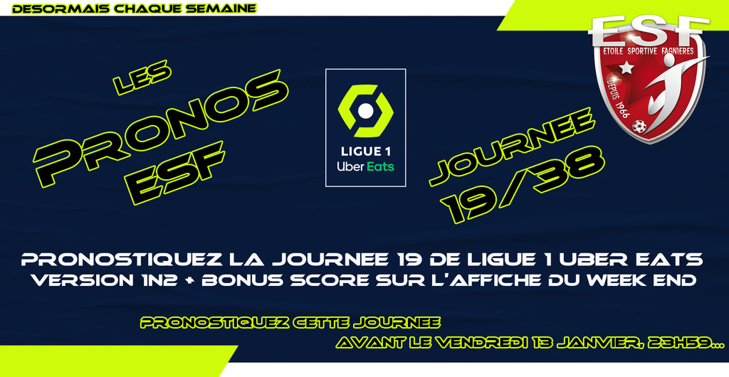 Un nouveau concours de prono débute aujourd'hui pour la journée 19/38 de Ligue 1 Uber Eats qui aura lieu le prochain week end, vous avez toute la semaine jusqu'à vendredi 23h59 pour pronostiquez en version "1N2" & l'affiche du Week end ainsi que le match de notre Partenaire du Stade de Reims en version "Score exact".