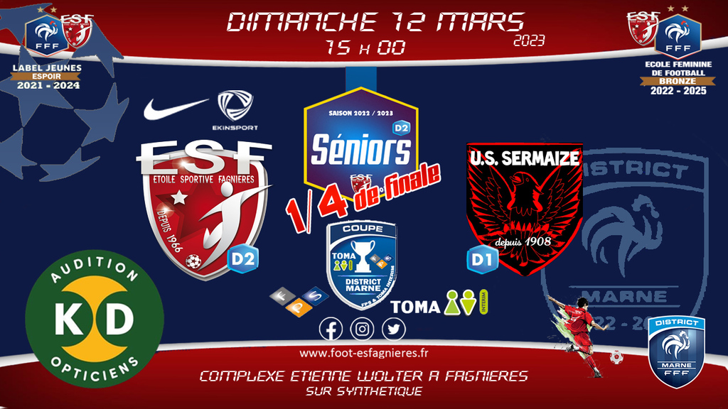 Venez nombreux soutenir nos Fagniérots pour ce 1/4 de finale de Coupe TOMA INTERIM & FPS, au complexe Etienne Wolter de Fagnières sur synthétique, coup d'envoi 15h00, entrée Grauite.