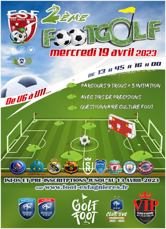 Réservé aux licenciés ESF, U6 à U11 dans un 1er temps, ce Foot-Golf aura lieu le mercredi 19 avril 2023 de 13h45 à 16h00, merci de vous présenter à 13h30 pour les inscrits au niveau de la buvette du club pour la répartition des équipes (PSG/OM/BARCA/REAL/SDR/ESTAC/LIVERPOOL/CITY/BAYERN).