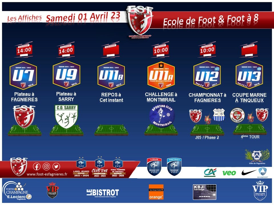 Avec les affiches de Coupe du Samedi => nos jeunes U11 toujours en course du challenge Monclin joueront leur qualification pour les phases finales à Montmirail, nos U13 iront à Tinqueux pour ce 4ème tour de Coupe District Marne.