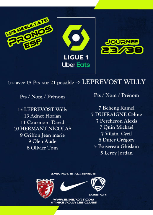 Pour cette 5ème journée de pronos Etoile Sportive de Fagnières/ Ekinsport , retrouvez les Résultats de cette journée J23/38 :