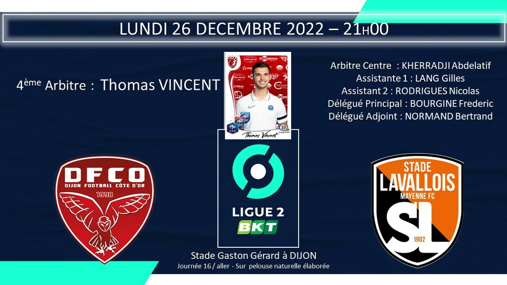 1 Seule désignation Arbitrale pour le prochain week end, mais quelle belle désignation et quel beau cadeau de Noël pour Thomas Vincent qui officiera en 4ème Arbitre pour sa 3ème rencontre de Ligue 2 BKT