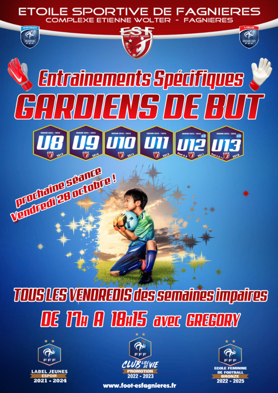 Tous les vendredis des semaines impaires au complexe Etienne Wolter de 17h00 à 18h15, gregory dispensera de séances spécifiques Gardien pour les gardiens des catégories U8 à U13.