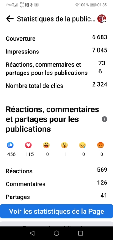 Bravo à tous. Grâce à vos likes et partages du post "CHAMPIONS" sur Facebook, nous venons de battre un nouveau record de diffusion en 24 heures avec un peu plus de 6680 personnes touchées. 569 likes, 126 commentaires pour "seulement" 41 partages !! 🎉👏👏