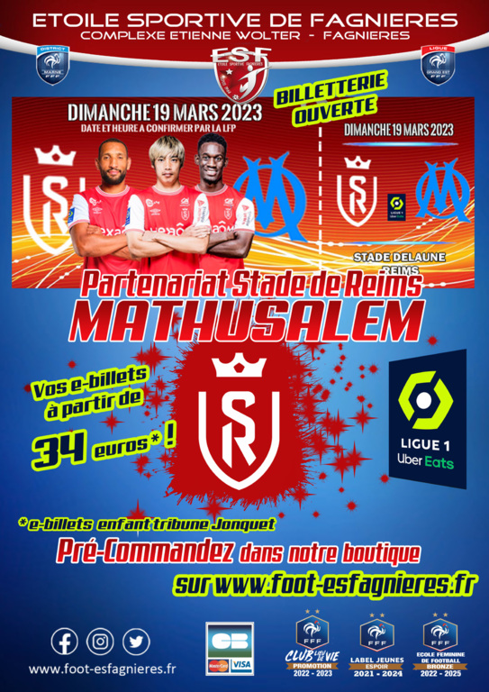 La billetterie pour le match Stade de Reims Vs OM est ouverte en pré-commande, si vous souhaitez réserver des places, c'est maintenant et ici jusqu'au 29 janvier 2023 !