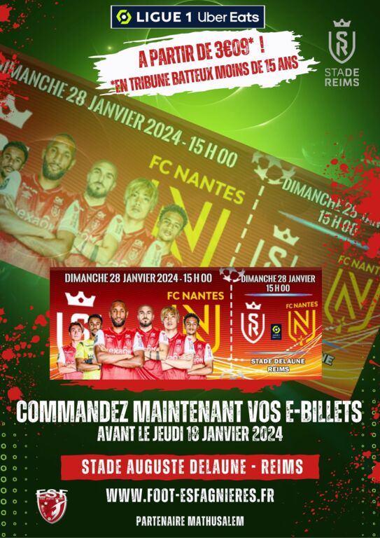Plus que quelques jours pour commander vos e-billets pour le prochain match du Stade de Reims à Delaune, actuel 6ème de Ligue 1 Uber Eats, nos Rouges & Blancs auront besoin de tous ses supporters pour rivaliser avec le haut de tableau & bousculer les grosses écuries !