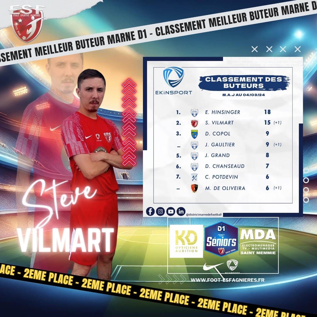 Bravo à Steve Vilmart qui conforte sa seconde place au classement des meilleurs buteurs Marne en inscrivant 1 but de plus ce dimanche face à l' AS St Brice Courcelles.👏👏