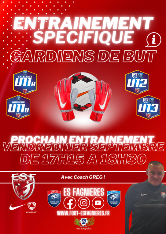 Pour cette 1ère session qui aura lieu ce vendredi 1er septembre de 17h15 à 18h30, les gardiens des catégories U10-U11-U12 & U13 sont invités à se présenter au Complexe sportif Etienne Wolter.