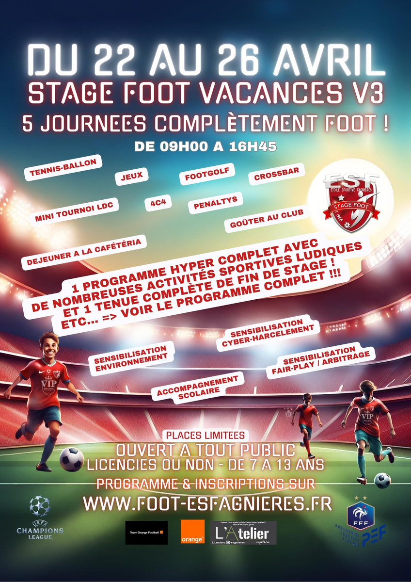 ⚽️ De nombreuses activités attendent nos Stagiaires pour cette V3 avec quelques nouveautés.....une version encore améliorée de celle du mois de Février, avec un joli cadeau de fin de stage, des déjeuners équilibrés chez notre Partenaire L’atelier cafétéria chaque midi....