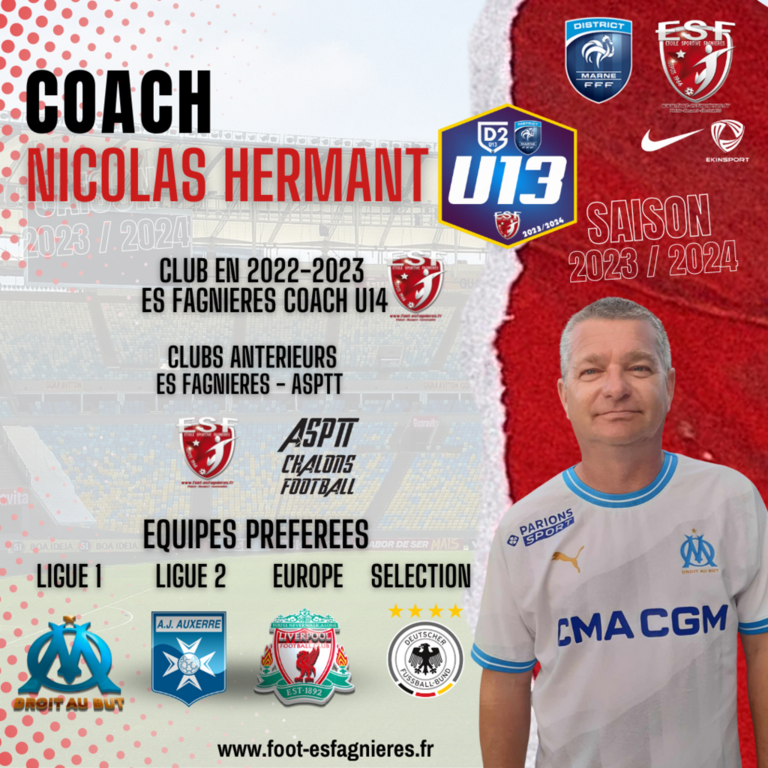 Nous avons le plaisir de vous présenter, pour ceux qui ne le connaîtrait pas encore & pour les nouveaux arrivants, Nicolas, Responsable de l'Ecole de Foot de l' ES Fagnières, et après quelques saisons coach U14 (foot à 11), prendra cette saison 2023/2024 la catégorie U13 (foot à 8 )