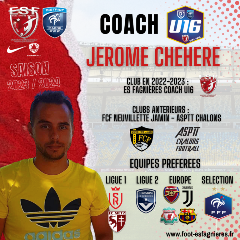 Pour ceux qui ne le connaisse pas encore, arrivée la saison passée, nous sommes heureux de vous Présenter Jerôme qui sera le Coach de la catégorie U16 District Marne D1 cette saison 2023/2024.