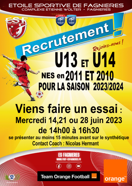 L' Etoile Sportive de Fagnières continue sa campagne de recrutement pour la saison 2023/2024 avec la catégorie U13/U14 des années 2011 et 2010.