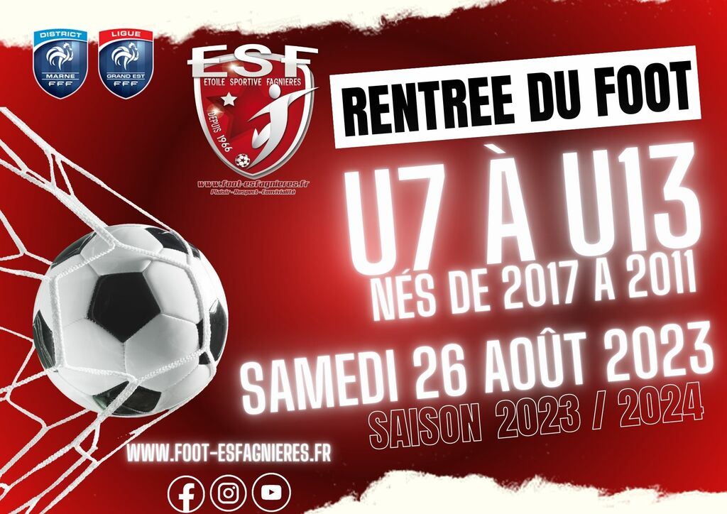 La rentrée du Foot pour la saison 2023/2024 aura lieu le SAMEDI 26 AOUT 2023 à 14h00 au complexe Etienne Wolter à Fagnières, 2 chemin de la terrière.
