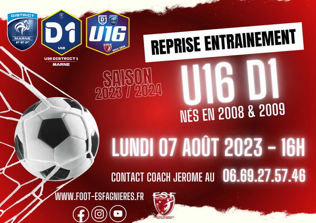 Nous vous informons que la catégorie U16 reprendra les entraînements pour la saison 2023/2024 le 𝐋𝐔𝐍𝐃𝐈 𝟎𝟕 𝐀𝐎Û𝐓 𝟐𝟎𝟐𝟑 à 𝟏𝟔𝐡𝟎𝟎 (se présenter 15 minutes avant) avec coach Jerôme que vous pouvez joindre au 06.69.27.57.46