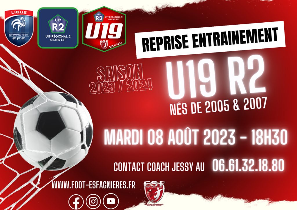 Nous vous informons que la catégorie U19 reprendra les entraînements pour la saison 2023/2024 le 𝐌𝐀𝐑𝐃𝐈 𝟎𝟖 𝐀𝐎𝐔𝐓 𝟐𝟎𝟐𝟑 à 𝟏𝟖𝐇𝟑𝟎 (se présenter 15 minutes avant) avec le nouveau coach Jessy & son adjoint Bryan que vous pouvez joindre au 06.61.32.18.80