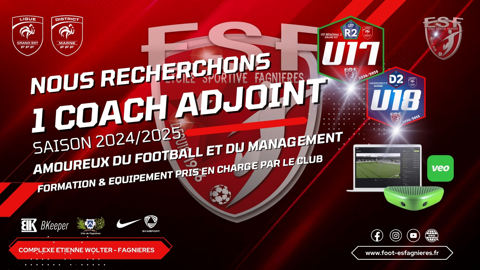 L' Etoile Sportive de Fagnières prendra en charge vos formations si vous en avez besoin ainsi que l'équipement nécessaire. (tenue du club, caméra Véo à disposition, Mini bus etc...)