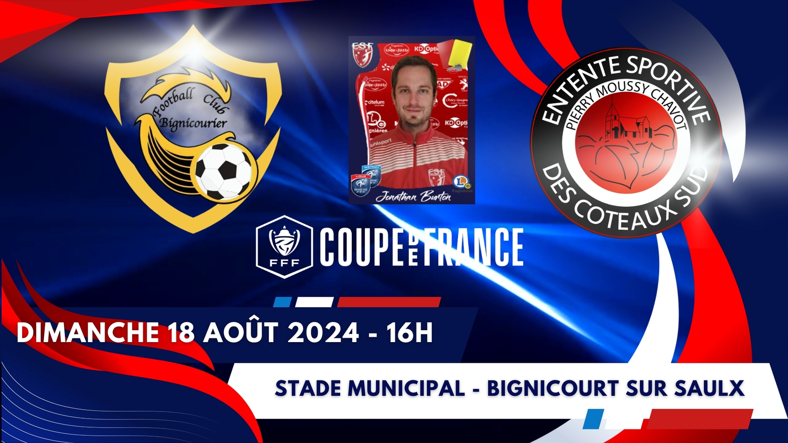 Après Thomas en Ligue 2 BKT & Gregory en Coupe de France de Football, c'est désormais au tour de Jonathan Burton qui débutera également sa nouvelle saison dès ce Dimanche avec un 1er tour de Coupe de France de Football à Bignicourt sur Saulx !